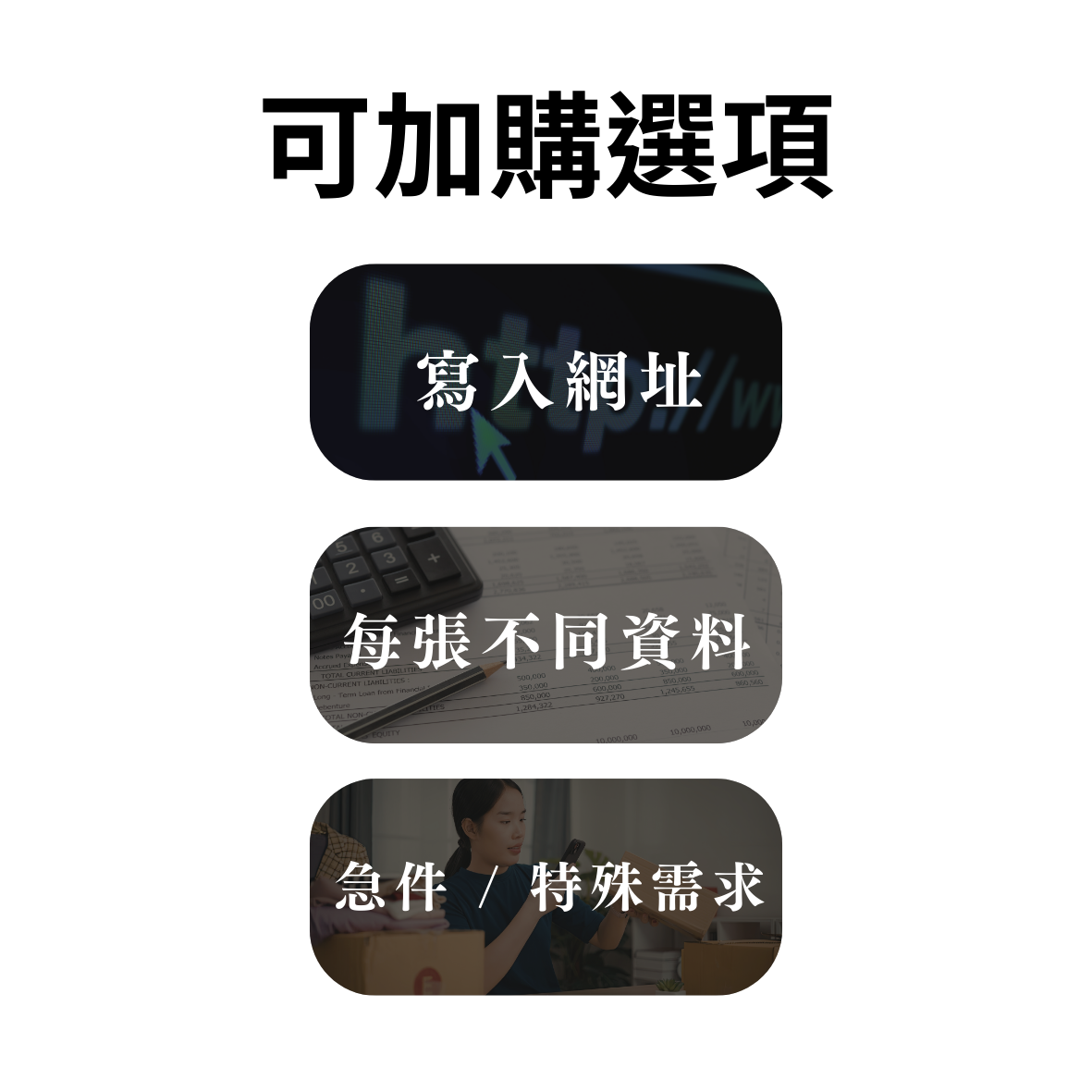 如需單一網址寫入、每張不同資料、打樣或急件,請先聯繫客服。