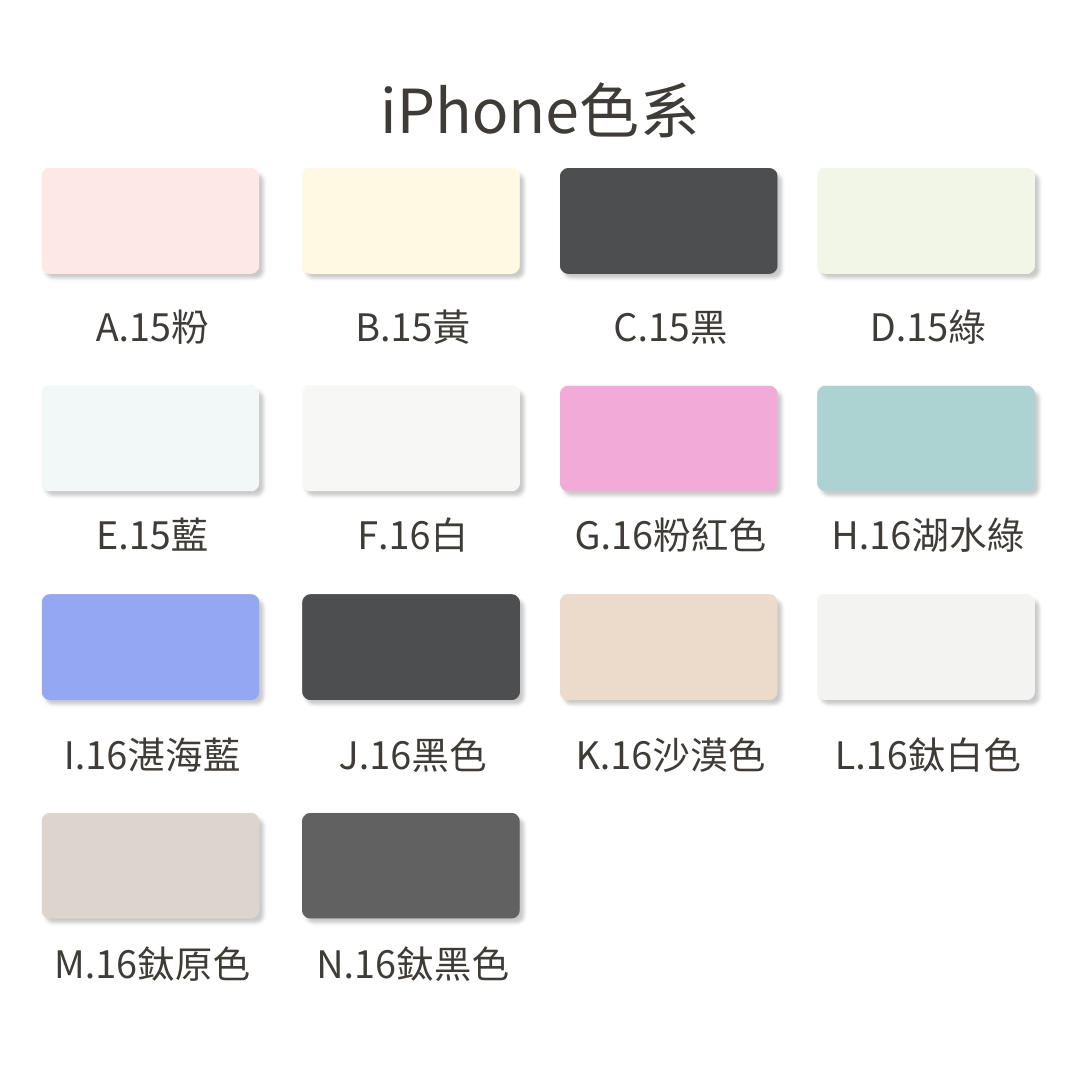 | 雙iciPhone顏色款 | A.15粉, B.15黃, C.15黑, D.15綠, E.15藍, F.16白, G.16粉紅色, H.16湖水綠, I.16湛海藍, J.16黑色, K.16沙漠色, L.16鈦白色, M.16鈦原色, N.16鈦黑色 |