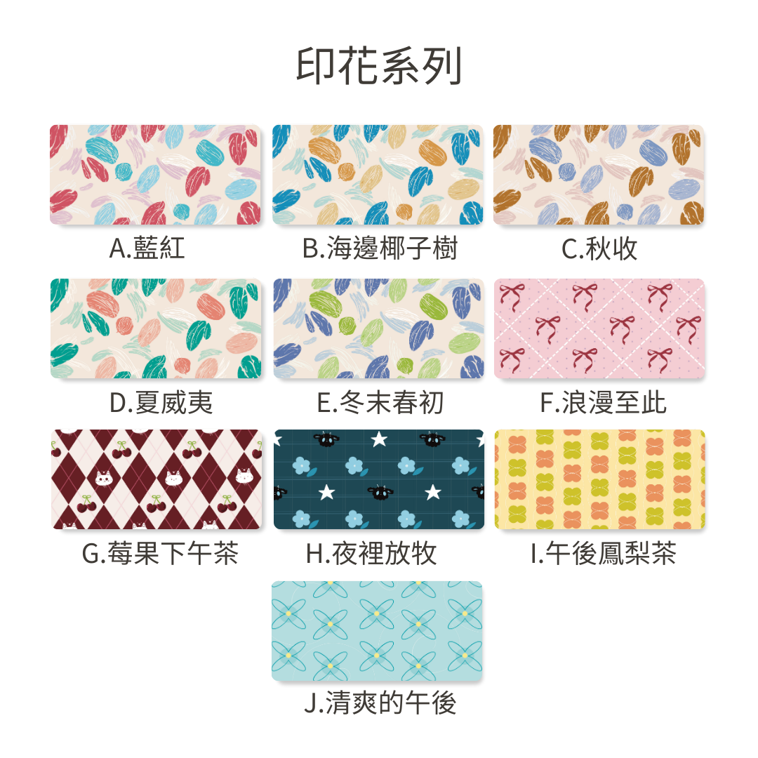 | 雙ic印花 | A.藍紅, B.海邊椰子樹, C.秋收, D.夏威夷, E.冬末春初, F.浪漫至此, G.莓果下午茶, H.夜裡放牧, I.午後鳳梨茶, J.清爽的午後 |