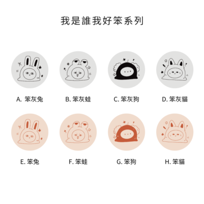 | ic+id 我是誰我好笨 | A款 笨灰兔, B款 笨灰蛙, C款 笨灰狗, D款 笨灰貓, E款 笨兔, F款 笨蛙, G款 笨狗, H款 笨貓 |